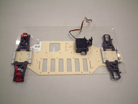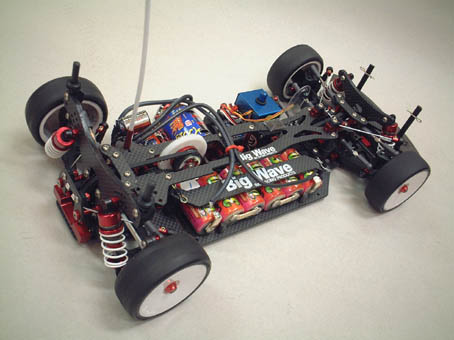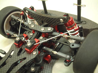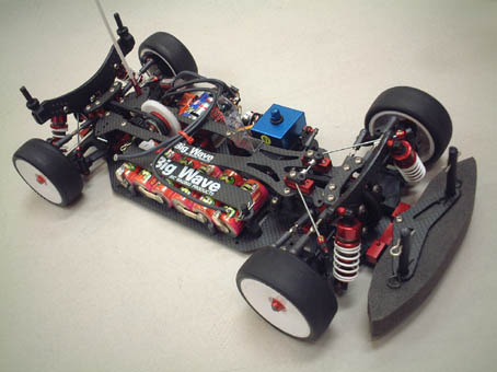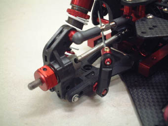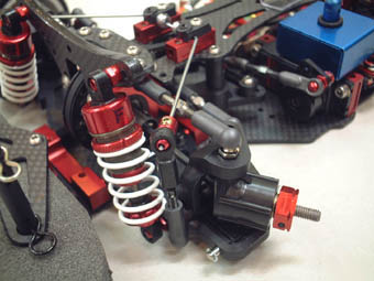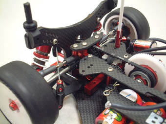 初代ラムダからの変更点は、サスアームをCE−4用に変更し、CハブナックルをTRF414M用に変更。ステアリングのスクラブをノーマルより軽減。ホイールスペーサーが不要になります。 スタビボールは写真の位置に穴あけして取り付けます。ユニバボーンはシグマ用で、アクスルをトビークラフト製TA04用を使用。トビーのTA04アクスルはジョイント部のサイズがヨコモ系と同じなのでそのまま使用可能。タミヤ純正TA04用ボーンが付かない不思議なアクスルです。 |