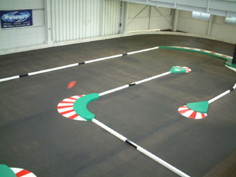 インフィールド出口もS字で構成されています。 また、コースガイドの黒いパーツの部分で連結が外せるのでレイアウトの変更ができます。十数パターンのレイアウトが作れるようです。 現在(2003.07.28)は写真のパターンで、時計回りです。これも、時々周回方向を変更するそうです。 |
